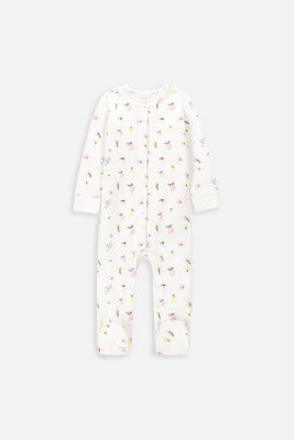 COCCODRILLO Pajac ze stopami - biały z wywijanymi rękawiczkami i nadrukiem na całości - rozmiar 74 - dla dziewczynki