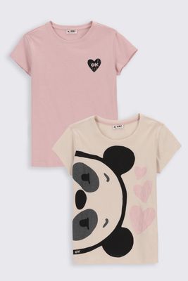 MOKIDA T-shirt z krótkim rękawem 2 pack - różowy z serduszkiem i beżowy z pandą - rozmiar 164 - dla dziewczynki