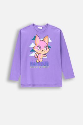 COCCODRILLO T-shirt z długim rękawem - fioletowy z nadrukiem kota na przodzie i falbaną - rozmiar 80 - dla dziewczynki
