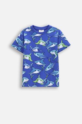 COCCODRILLO T-shirt z krótkim rękawem - niebieski z nadrukiem w wesołe rekiny - rozmiar 104 - dla chłopca