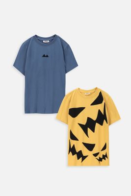 MOKIDA T-shirt z krótkim rękawem 2 pack - miodowy na Halloween i niebieski z motywem gór - rozmiar 146 - dla chłopca
