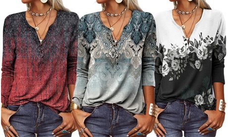 Women Button Up Printed Henley Top M in Blue | Medium