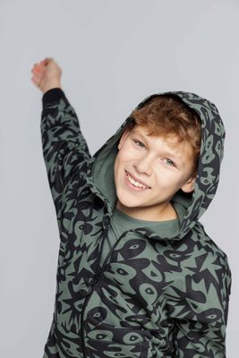 MOKIDA Bluza rozpinana z kapturem - dresowa khaki z nadrukiem na całości - rozmiar 116 - dla chłopca