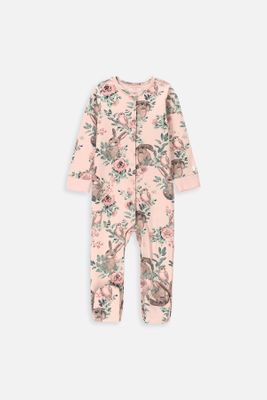 COCCODRILLO Pajac ze stopami - różowy z wywijanymi rękawiczkami i nadrukiem w kwiaty - rozmiar 86 - dla dziewczynki