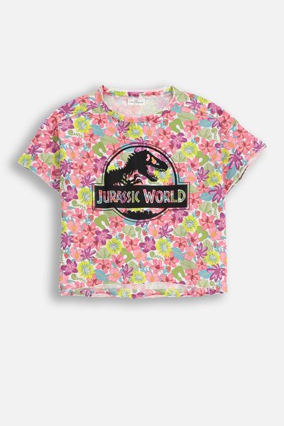 Tričko s krátkým rukávem - vícebarevný s květinovým potiskem a licencovaným potiskem Jurassic Park - Velikost: 128 - pro dívku