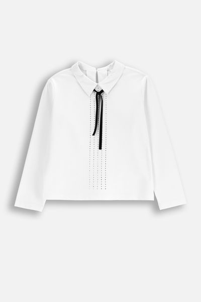 tričko s dlouhým rukávem - Bílá s ozdobnou páskou a kamínky - Velikost: 104 - pro dívku