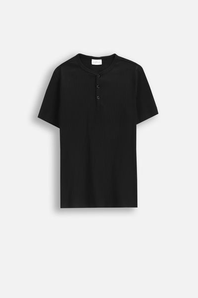Pruhované tričko s krátkým rukávem - černý s knoflíky u výstřihu - Velikost: 164 - pro chlapce