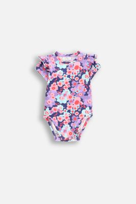 COCCODRILLO Body z krótkim rękawem - wielokolorowy z falbankami i nadrukiem w kwiaty i opcją rośnie wraz z dzieckiem - rozmiar 62 - dla dziewczynki