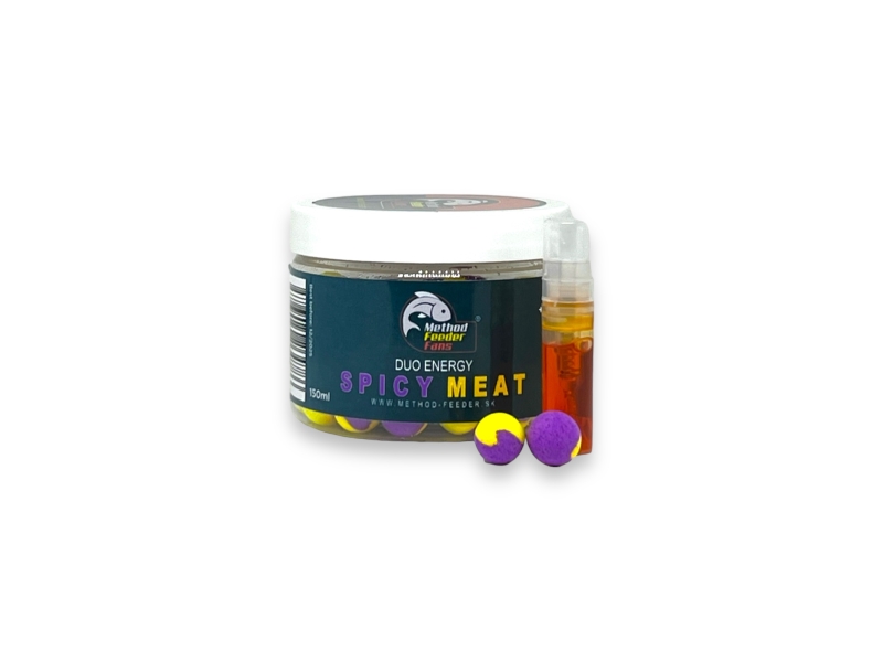 METHOD FEEDER FANS - Plovoucí Boilies Duo Energy Kořeněné Maso 12 mm 150 ml + Sprej Esence 2 ml