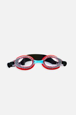 AQUA2UDE Okulary do pływania dla dzieci - Czerwona wyścigówka z szachownicą - silikonowe w etui 3+ - rozmiar ONE SIZE -