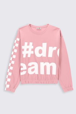 MOKIDA T-shirt z długim rękawem - różowy z gumką i nadrukami - rozmiar 110 - dla dziewczynki